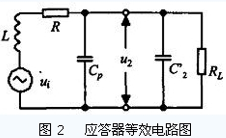 當(dāng)RFID 的線圈天線進(jìn)入讀寫器產(chǎn)生的交變磁場中,RFID 天線與讀寫器天線之間的相互作用就類似于變壓器,兩者的線圈相當(dāng)于變壓器的初級線圈和次級線圈. 由RFID 的線圈天線形成的諧振回路如圖2所示,它包括RFID 天線的線圈電感L 、寄生電容Cp和并聯(lián)電容C2′,其諧振頻率為: