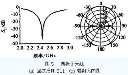 當(dāng)單個(gè)振子臂的長度l =λ/ 4 時(shí)(半波振子) ,輸入阻抗的電抗分量為零,天線輸入阻抗可視為一個(gè)純電阻. 在忽略天線粗細(xì)的橫向影響下,簡單的偶極子天線設(shè)計(jì)可以取振子的長度l 為λ/ 4 的整數(shù)倍,如工作頻率為2. 45 GHz 的半波偶極子天線,其長度約為6 cm.當(dāng)要求偶極子天線有較大的輸入阻抗時(shí),可采用圖4b的折合振子.