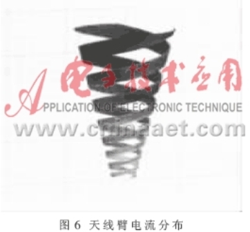 圖6表示頻率f=80MHz時(shí)電流在天線臂上的分布,可以看出傳導(dǎo)電流從天線饋電點(diǎn)(即圓錐頂部一端)流入,先經(jīng)過傳輸區(qū)(約下面的2圈),再向上是輻射區(qū)(約第3圈),最后為衰減區(qū)(后面幾圈)。在傳輸區(qū)內(nèi),電流大小變化不明顯,到達(dá)輻射區(qū)后,隨著大量能量以電磁波的形式傳播,電流迅速減小,最后經(jīng)過衰減區(qū),電流逐漸減小至零,這符合天線一般規(guī)律。其中,輻射區(qū)的位置與頻率有關(guān),即位于波長(zhǎng)近似于圓錐截面周長(zhǎng)的地方。可以想象,不同頻率會(huì)對(duì)應(yīng)不同的輻射區(qū)位置,這是CLS天線的工作特性,也是CLS天線具有寬帶特性的原因。