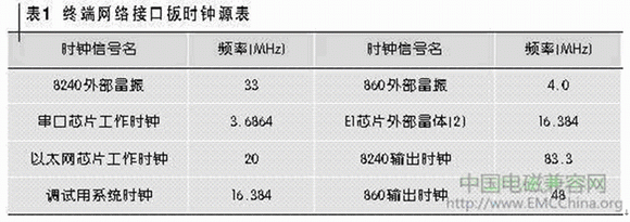 因?yàn)榻K端網(wǎng)絡(luò)接口板上沒有412.5 MHz和577.5 MHz這兩個(gè)頻率信號,所以懷疑這兩個(gè)頻點(diǎn)可能是某些頻率信號的諧波分量。高速電路中,時(shí)鐘電流是第一輻射源。筆者對終端網(wǎng)絡(luò)接口板上的各時(shí)鐘信號進(jìn)行了統(tǒng)計(jì),如表1所示。