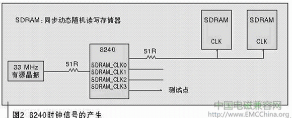 圖2所示為8240時(shí)鐘信號的產(chǎn)生原理圖。8240外部有源晶振產(chǎn)生33 MHz的振蕩頻率,送入8240芯片,經(jīng)內(nèi)部PLL(鎖相環(huán))鎖相倍頻,輸出83.3 MHz頻率,作為SDRAM(同步動(dòng)態(tài)隨機(jī)讀寫存儲器)的工作時(shí)鐘,8240有4個(gè)引腳可以同時(shí)送出該83.3 MHz的時(shí)鐘:SDRAM_CLK0~SDRAM_CLK3,而且可以在8240內(nèi)部寄存器中設(shè)置開關(guān)。該單板在電路設(shè)計(jì)時(shí),使用SDRAM_CLK0作為SDRAM工作時(shí)鐘,另一路SDRAM_CLK3送至一測試點(diǎn),方便調(diào)試時(shí)測量時(shí)鐘信號,其余2路設(shè)置為關(guān)閉狀態(tài),不對外輸出時(shí)鐘。