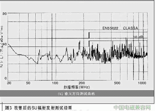 筆者用高速示波器測量出網(wǎng)絡(luò)接口板的工作地噪聲(Vp-p)為96 mV,中頻板工作后,噪聲增至130 mV以上。此測量方法可能存在偏差,但總體的趨勢是2塊單板同時(shí)工作后,的確增加了地線噪聲,對EMI有一定的影響,只不過影響是有限的。