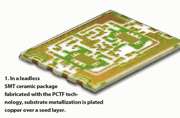 由于保密原因,這里不能提及軍事和航天用戶使用PCTF技術(shù)的具體方法。但是值得一提的是:高功率(10瓦)氣密無引腳SMT封裝器件,一般都是基于氧化鋁和鈹陶瓷襯底的。這些器件都經(jīng)過嚴(yán)格的加速老化和功能測(cè)試,能工作在14GHz的頻段。