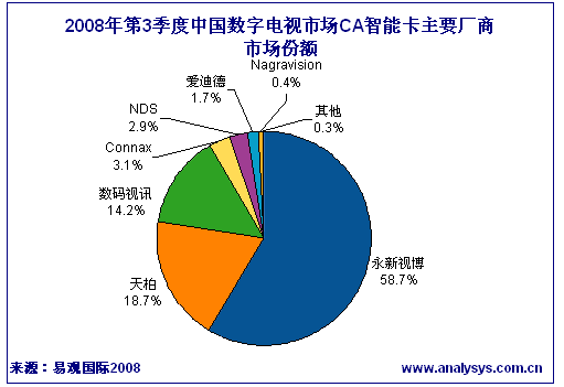 永新視博以58.7%的過半市場份額保持絕對領(lǐng)先,較上季度市場份額上升了15個百分點,而天柏和數(shù)碼視訊分別發(fā)卡67萬和51萬,都比上期有不少程度的下降。