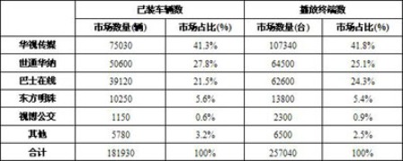 2008年,中國車載公交視聽系統(tǒng)市場(chǎng)品牌競(jìng)爭(zhēng)格局中,華視傳媒憑借其強(qiáng)大的采用數(shù)字移動(dòng)電視技術(shù)的聯(lián)播網(wǎng)以及其靈活獨(dú)特的合作模式,成為中國車載公交視聽系統(tǒng)市場(chǎng)已裝車輛和播放終端兩大指標(biāo)的市場(chǎng)第一,緊隨其后的是世通華納和巴士在線,東方明珠由于主要局限于上海市場(chǎng),市場(chǎng)排名為第四。作為地方的車載視聽系統(tǒng)運(yùn)營商視博公交,則完全局限于杭州本土市場(chǎng)發(fā)展。DMG集團(tuán)公司,由于更加集中于地鐵視頻廣告的運(yùn)營和推廣,在全國的整體實(shí)力上,還不足以顛覆目前的格局。