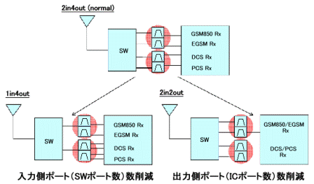 在手機(jī)的高頻率無線通信電路中使用的表面波濾波器,分為CDMA收發(fā)用的級間濾波器和GSM用的TOP濾波器等。村田的濾波器不僅具有低損耗和高抑制度的電特性,還由小型、薄型的各種產(chǎn)品尺寸構(gòu)成了豐富的商品線,可以對應(yīng)各種電路設(shè)計的需求。例如, 在多頻段發(fā)展的高頻無線通信電路中,為了減小電路基板上的貼裝面積,將兩個頻帶的單濾波器(產(chǎn)品尺寸1.35×1.05×0.5mm)合二為一,制造出了雙濾波器(產(chǎn)品尺寸1.8×1.35×0.5mm)。此外還運用特殊的技術(shù)制造許多獨特的商品,如將雙層濾波器的輸入端合并為一個的1in4out產(chǎn)品,以及將平衡器的輸出端合并為一的2in2out產(chǎn)品等。通過共用輸入端可以節(jié)省原本用于分頻的開關(guān)(SW)。同時,共用平衡輸出端可以使連接濾波器的高頻IC的端口數(shù)目減少(圖3)。這是在表面波濾波器的設(shè)計中通過調(diào)整阻抗和相位等方法,從而使差分端口實現(xiàn)共用。這些濾波器可以在多頻帶化發(fā)展的高頻無線電路中,為外圍電路的簡化及電路整體的小型化做出貢獻(xiàn)。今后村田制作所將繼續(xù)致力于研發(fā)更小型化和高性能化,同時又具有輸入端以及輸出端共用功能的單濾波器、雙濾波器產(chǎn)品。