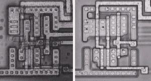 圖2:NAND門驅動一個反向器的光學照片(包含金屬層和去掉金屬層)。