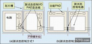 圖5a是在接觸式智能卡芯片的發(fā)展過程中曾大量采用的測試態(tài)控制方式:使用額外的I/O管腳和芯片內部電路相連,該連線通過劃片槽,這樣芯片劃斷后就不能通過簡單控制該管腳進入測試態(tài)。由于FIB修補技術的出現,這個手段已經過時。圖5b是最有潛力的替代方案:在劃片槽和鄰近的芯片中設計部分控制電路,從而得到不可逆的測試態(tài)控制手段。