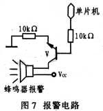 顯示電路采用4位共陽LED數(shù)碼管,碼段由74LS244驅(qū)動(dòng)電路驅(qū)動(dòng);驅(qū)動(dòng)電路由PNP晶體管8550驅(qū)動(dòng)。圖7給出報(bào)警電路。它采用晶體管驅(qū)動(dòng)。