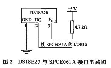 溫度檢測(cè)單元采用D1S8B02型傳感器,是美國(guó)DALLAS公司推出的一種改進(jìn)型智能溫度傳感器,與傳統(tǒng)的熱敏電阻等測(cè)溫元件相比,它能直接讀出被測(cè)溫度,并且可根據(jù)實(shí)際要求通過(guò)編程實(shí)現(xiàn)9~12位的數(shù)字值讀數(shù)方式。DS18BZo與SPCEo61A單片機(jī)的接口電路如圖2所示,由于DS18B20傳感器支持“一線總線”接口,因此只需將DS18B20信號(hào)線接到單片機(jī)的1位1/0線上即可,而且在1根1/0線上可以掛接多個(gè)傳感器實(shí)現(xiàn)多點(diǎn)溫度測(cè)量。