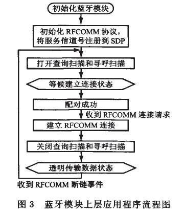 本系統(tǒng)是基于藍(lán)牙的串口應(yīng)用模型SPP(SerialPortProfile)實(shí)現(xiàn)無(wú)線數(shù)據(jù)的透明傳輸,在核心協(xié)議棧之上編寫(xiě)自己的上層應(yīng)用程序。CSR的藍(lán)牙核心協(xié)議棧包括HCI、LZCAP、SDP、RFCOMM等,以固件的形式提供給開(kāi)發(fā)人員,用戶編寫(xiě)的應(yīng)用程序和協(xié)議棧一起運(yùn)行在CSR嵌人式環(huán)境中。在CSR程序中,不同任務(wù)之間可以異步地發(fā)送消息,每一個(gè)任務(wù)在創(chuàng)建的時(shí)候可以讓其中一個(gè)擁有消息隊(duì)列,其它的就把發(fā)給任務(wù)的消息提交給該消息隊(duì)列,由任務(wù)調(diào)度程序自動(dòng)運(yùn)行獲得任務(wù)的消息。藍(lán)牙模塊上層應(yīng)用程序流程如圖3所示。