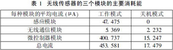 無(wú)線傳感器的三個(gè)主要消耗電能的模塊是:感應(yīng)模塊、無(wú)線通信模塊和微控制器模塊,如表1所示。這三個(gè)模塊主要有兩個(gè)操作模式:關(guān)機(jī)模式和工作模式。在這兩種模式下分析了每種模塊的功耗,以及總的消耗量。