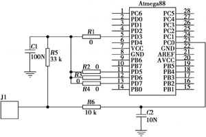 對(duì)微控制器芯片選擇Atmel ATmega88,因?yàn)樗哂械凸?,還有待機(jī)模式和主動(dòng)模式的快速轉(zhuǎn)換功能,所以無(wú)線傳感器能夠在非常短的時(shí)間完成數(shù)據(jù)的測(cè)量和傳輸;它有一個(gè)內(nèi)置的掉電檢測(cè)電路,可用來(lái)提醒用戶傳感器網(wǎng)絡(luò)電池是否需要更換;它還有一個(gè)內(nèi)置的A/D轉(zhuǎn)換器,可以將傳感器的模擬信號(hào)轉(zhuǎn)換成具有10位數(shù)字值的數(shù)字信號(hào)(零代表0V,210-1代表電源電壓和最大可能電壓)。