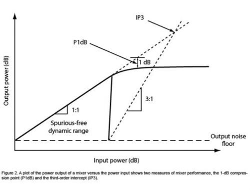 在標準或線性工作條件下,混頻器的變頻損耗是恒定的,與RF功率無關(guān)。這意味著,當你以1dB的幅度增加輸入功率時,輸出功率也會以1dB遞增。在P1dB壓縮點,輸入功率增加,以便輸出不隨輸入功率線性增加。這也是混頻器變頻損耗高出理想值1dB的原因(圖2)。
