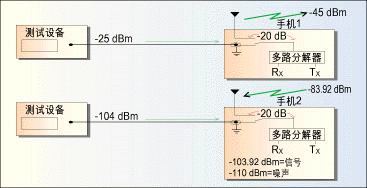 多數(shù)情況下,手機(jī)會因屏蔽很差的RF電纜或未連接的天線端口很容易受到噪聲影響。一般來講天線端口是噪聲的主要來源,特別是如果天線是在測試時(shí)才接上。圖3表示正在進(jìn)行靈敏度試驗(yàn)的手機(jī)對另一個(gè)正向鏈路功率-25dBm手機(jī)可能產(chǎn)生的影響情況,手機(jī)1是正在進(jìn)行測試的手機(jī),具有較高的-25dBm正向鏈路功率。由于手機(jī)1發(fā)射信道功率為-25dBm,假設(shè)未連接開關(guān)的衰減是20dB,那么通過天線未連接端口泄露出的信號可能高達(dá)-45dBm。