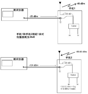 假設(shè)在最壞情況下,手機(jī)1距離手機(jī)2 1米遠(yuǎn)(假定只有遠(yuǎn)場效應(yīng),近場因素很難考慮),將兩個(gè)手機(jī)平行對準(zhǔn)且手機(jī)之間沒有衰減材料,則手機(jī)2的天線會收到一個(gè)高達(dá)-83.92dBm的信號。這樣手機(jī)2的接收器就會有-103.92dBm干擾信號,因?yàn)榧僭O(shè)天線到過電開關(guān)的衰減為20dB。這個(gè)例子說明了一個(gè)手機(jī)在另一手機(jī)接收信道上產(chǎn)生噪聲的一般原因,根據(jù)例中所做假設(shè),在實(shí)際執(zhí)行中還有很多情況會引起不同的結(jié)果,這也為認(rèn)識哪種噪聲會從一個(gè)手機(jī)進(jìn)入另一個(gè)手機(jī)信道提供了基礎(chǔ)。方位、距離、開關(guān)衰減、屏蔽、天線設(shè)計(jì)和實(shí)現(xiàn)方式等,這些因素都會在引入噪聲的整個(gè)轉(zhuǎn)換中發(fā)揮作用。
