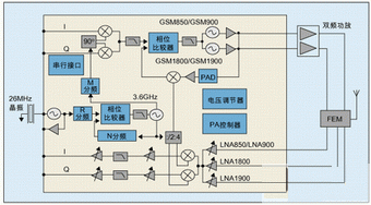 RF集成一個重要的發(fā)展出現(xiàn)在大約三年以前,當(dāng)時RF技術(shù)和數(shù)字基帶調(diào)制解調(diào)器的發(fā)展使得在無線手機(jī)中用直接下變頻接收器替代超外差射頻器件成為可能。超外差射頻器件使用多級混頻器、濾波器和多個電壓控制振蕩器(VCO),已經(jīng)很好地應(yīng)用了多年,但直接變頻射頻器件的集成度能夠大大減少GSM RF總體元件數(shù)。在上世紀(jì)九十年代后期,一個典型的單頻段超外差RF子系統(tǒng)包括PA、天線開關(guān)、LDO、小信號RF和VCTCXO,需要大約200個分立器件;今天,我們能夠設(shè)計(jì)一個具有四頻段功能的直接變頻系統(tǒng),集成了VCO、VCXO和PLL回路濾波器,而它的元件數(shù)卻少于50個。