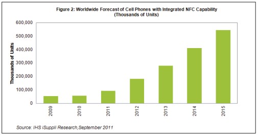 圖中所示為IHS iSuppli公司對NFC手機(jī)全球出貨量的預(yù)測。
