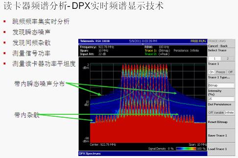 圖4:泰克RTSA集成的DPX實(shí)時(shí)頻譜顯示技術(shù)非常適合RFID的讀寫器頻譜分析。