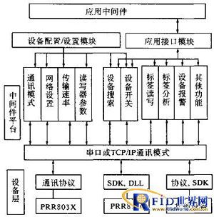 RFID技術(shù)的基本工作原理是:標(biāo)簽進入磁場后,接收讀寫器發(fā)出的射頻信號,憑借感應(yīng)電流所獲得的能量發(fā)送出存儲在芯片中的產(chǎn)品信息(Passive Tag,無源標(biāo)簽或被動標(biāo)簽),或者主動發(fā)送某一頻率的信號(Active Tag,有源標(biāo)簽或主動標(biāo)簽):讀寫器讀取信息并解碼后,送至中央信息系統(tǒng)進行有關(guān)數(shù)據(jù)處理。中間件是介于應(yīng)用系統(tǒng)和系統(tǒng)軟件之間的一類軟件,它使用系統(tǒng)軟件所提供的基礎(chǔ)服務(wù),銜接網(wǎng)絡(luò)上應(yīng)用系統(tǒng)的各個部分或不同的應(yīng)用,以達(dá)到資源共享、功能共享的目的.在具體實現(xiàn)上,中間件是一個用API定義的軟件層,具有強大的通信能力和良好的可擴展性。