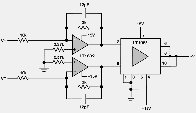 盡管共模信號(H橋的電源電壓)很大,由于這些放大器具有高共模抑制特性,因此仍可精確測量電壓和電流。LT1632逆變器將電壓信號衰減至LT1995的輸入共模范圍內(nèi)。共同使用LT1632s和LT1995產(chǎn)生的輸出電壓ΔV是負(fù)載電壓的0.1倍。