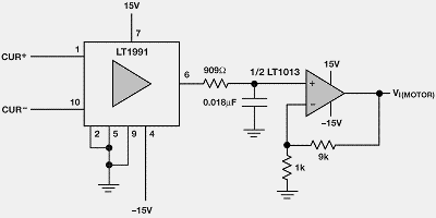 LT1991的低通RC網(wǎng)絡(luò)衰減100kHz(諧波)饋通,進(jìn)一步提高電路的高頻共模抑制。由于電機(jī)線圈電感高,限制了電機(jī)電流的帶寬(帶寬限制量與電機(jī)型號相關(guān),但不會接近100KHz),因此濾波時不會損失有用信息。感應(yīng)電阻小,相應(yīng)的電流感應(yīng)電壓隨之減小,從而可限制電路的動態(tài)范圍,因此如果必要的話可提高LT1013的增益。當(dāng)增益較高(大于100)時,需要用更大帶寬的變壓器替代LT1013。