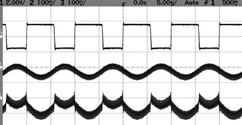 該圖對應(yīng)的是大電阻電機(jī)的情況,占空比仍為60%,感應(yīng)電阻為0.1Ω。同樣,軌線1為電壓,軌線2為電流,軌線3為瞬態(tài)功率。值得注意的是,當(dāng)負(fù)載增大,平均電機(jī)電流也相應(yīng)增大(從絕對意義而言)。用高阻抗電壓計測得的RMS功耗為20mV (2瓦)。