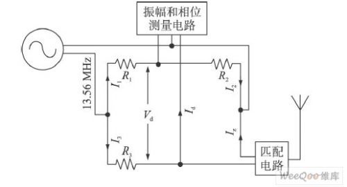 (1)測量電橋 用來測試天線的反射系數(shù)。主體部分為惠斯通電路,如圖4所示。其電路中的直流電源用波形產生器替代,用來生成13. 56 MHz的正弦載波信號。其中電阻R1、R2、R3 都為50 Ω。
