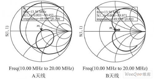 結果如圖7所示,對于A, B兩種天線的任何一種,都找到了最優(yōu)C1 和C2 的組合。當頻率為13. 56MHz時,兩類天線的反射系數(shù)雖然與0點都有一定的偏差,但其偏差都在可接受范圍之內。