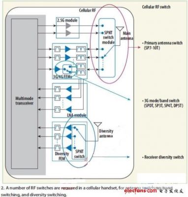 圖2:蜂窩手機中要求使用大量射頻開關(guān),分別用于天線切換、頻段切換和分集切換。