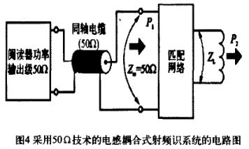本文研究的RFID讀寫器頻率為13.56 MHz,為有效抑制功率反射、寄生輻射等高頻效應(yīng),通常是將讀寫器天線通過同軸電纜連接到讀寫器的高頻模塊,同軸電纜阻抗為50 Ω。因此,天線的阻抗匹配就是通過一定的無源匹配電路來改變讀寫器天線的輸入阻抗,使其與同軸電纜的阻抗保持一致,這樣就可使能量通過同軸電纜幾乎無損失的從讀寫器傳送出去。圖4為采用50 Ω技術(shù)的電感耦合式射頻識(shí)別系統(tǒng)電路。