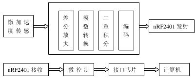 加速度傳感器采集加速度信號,單片機(jī)通過軟件實(shí)現(xiàn)對加速度信號的二重積分而轉(zhuǎn)換為位移信號,經(jīng)編碼處理至藍(lán)牙發(fā)射芯片,通過天線將數(shù)據(jù)發(fā)射出去。