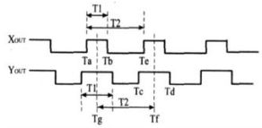 為了實(shí)現(xiàn)高精度測量,考慮到T2易受溫度漂移的影響,必須周期性地更新T2的平均值。一種新的改進(jìn)型脈寬調(diào)制(PWM)解碼方法是通過占空比調(diào)制在X軸和Y軸使用相同的三角形參考波 ,使得每個(gè)周期中 T1的中點(diǎn)達(dá)到同步 ,這種方法能加快數(shù)據(jù)傳輸時(shí)間,也稱之為高速解碼,X軸和Y軸的占空比輸出如圖2所示。