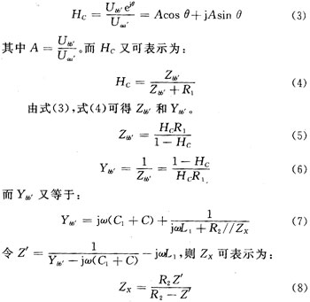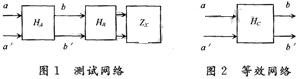 圖1中網(wǎng)絡(luò)HA,HB,ZX組成測(cè)試網(wǎng)絡(luò),圖2中HC為其等效網(wǎng)絡(luò)。HA,HB為無源線性雙口網(wǎng)絡(luò),起著匹配、隔離和濾波的作用,使得在bb′處能觀測(cè)到比較好的正弦波。HC的傳輸函數(shù)可以表示為:
