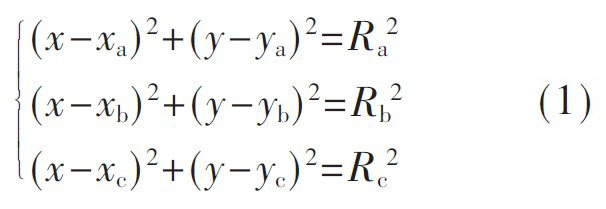 如圖3 所示, 在游戲場(chǎng)館C 區(qū)內(nèi), 設(shè)編號(hào)分別為a 、b 、c 的三個(gè)有源讀寫(xiě)器的位置為(xa,ya) , (xb,yb) , (xc,yc) ,游客的位置坐標(biāo)(x,y), 三個(gè)讀卡器到游客的距離分別為Ra、Rb、Rc, 由時(shí)間信息定位方法(TOA) 可得式(1) , 即可求解游客的位置坐標(biāo)(x,y)。
