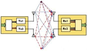 通過使用多路傳輸方式,在每個接收天線上采用空間微分技術(shù),使得DSP能夠進行信號分離并恢復原始的兩路數(shù)據(jù)流。使用相同射頻信道的獨立發(fā)射器,在它們各自的天線上發(fā)送出獨立的數(shù)據(jù),然后,接收天線匯集所有發(fā)射器的復合信號。通過巧妙設(shè)計的MIMO報文和先進的DSP,就可以恢復出獨立的數(shù)據(jù)流。數(shù)據(jù)速率與發(fā)射器和天線數(shù)量之間具有幾乎線性的關(guān)系,速率的提高并不需要增大信道帶寬。