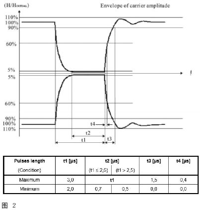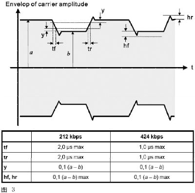 由于NFC106kbps為100%ASK調(diào)變,所以對整個High/Low信號的封包結(jié)構(gòu)都有相當(dāng)詳細的定義。其中幾個參數(shù)包括從100%下降到5%Am時間(t1)、5%Am持續(xù)時間(t2)、Am由5%上升至60%時間(t4)即overshoot的范圍。而212/424kbps則是8%~30%的調(diào)變率。