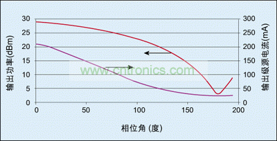 圖3顯示了輸出功率和輸出級源電流與放大器驅(qū)動信號相位角之間的關(guān)系,該圖數(shù)據(jù)得自于一個運行在5.25GHz、Vdd為5V的放大器。請記住,放大器已進入深度飽和,因而工作在恒定的電壓振幅下,但要注意源電流與異相角有很大的關(guān)系。這說明每個放大器的阻抗(往合并器方向看)在低輸出功率時確實增大,而源電流在下降。