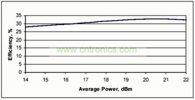 驅(qū)動級對總體功耗也有貢獻。包括驅(qū)動級在內(nèi)的功率添加效率(PAE)在7.8dB后退點處大于33%,此后退效率可以在廣泛的電源中實現(xiàn)。圖5顯示了各種電源電壓下放大器后退7.8dB時的效率,注意,確實有兩種方式控制放大器的瞬時輸出功率,即異相和改變電源電壓。電源電壓通常用于緩慢改變平均輸出功率,相位角用于快速改變信號的瞬時包絡(luò)線。