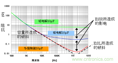 多層陶瓷電容器具有良好的高頻特性。與其他電容器相比,由于其具備能夠減小電阻及殘余電感的構(gòu)造,因此在高頻條件下也能保證 電容器的工作。圖3、圖4所示為等效電路與電感的特性。由于鋁電解電容器及鉭電解電容器的ESR較高,因此阻抗也就較高。但陶瓷電容器卻是頻率越高則阻抗 越低,這對于去藕來說非常有效,并能夠發(fā)揮高性能的濾波能力。