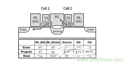 1 第3代SuperFlash存儲(chǔ)單元的結(jié)構(gòu)和典型工作條件。圖中給出了兩個(gè)共用源極和擦除柵極的單元。圖中用箭頭指示燒寫(單元1)和擦除(單元2)期間的電子轉(zhuǎn)移情況。WL為字線(選擇柵極),CG為耦合柵極,EG為擦除柵極,F(xiàn)G為浮置柵極。