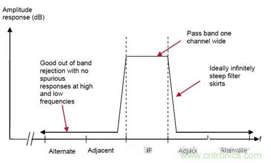 【導讀】中頻濾波器相對于RF信號,工作的頻率比較低。理想的中頻濾波器如文中所示,具有平坦的通帶特性及好群延遲特性,能夠無失真的通過希望的信號,同時具有很陡的過度帶,能夠提供足夠的鄰道抑制能力。