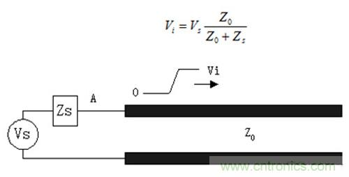下圖描繪了加在長的傳輸線上的初始波形,初始的電壓Vi傳送到傳輸線上直到到達(dá)末端,Vi的幅度通過驅(qū)動(dòng)器電阻和傳輸線阻抗的分壓來決定: