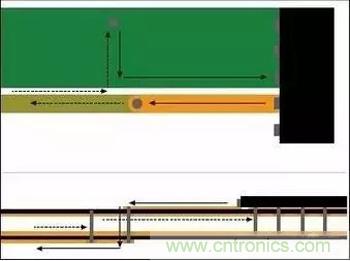 流經(jīng)所布線路的所有電流都有相等的回流。耦合策略固然很多,不過回流通常流經(jīng)相鄰的接地層或與信號線路并行布置的接地。在參考層繼續(xù)時,所有耦合都僅限于傳輸線路,一切都非常正常。不過,如果信號線路從頂層切換至內(nèi)部或底層時,回流也必須獲得路徑。