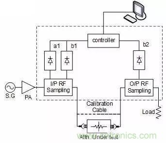 題外話:其實(shí)功率系數(shù)這個(gè)東東,不光是衰減器有,所有工作在大功率條件下的器件都有,只要工作功率的變化范圍比較大,就必須要考慮這個(gè)指標(biāo)。如何測(cè)試這個(gè)指標(biāo),一般需要一套標(biāo)準(zhǔn)的測(cè)試系統(tǒng),當(dāng)然也可以自己來(lái)搭建。下圖就是上篇提到的一個(gè)標(biāo)準(zhǔn)的測(cè)試功率系數(shù)的框圖,供大家參考: