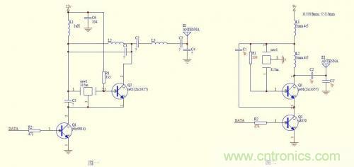 兩電路基本原理一致,都是由0、1信號(hào)控制實(shí)現(xiàn)高頻脈沖發(fā)射的電路,工作頻率由晶振決定,從穩(wěn)定性上分不出優(yōu)劣。圖二電路簡(jiǎn)潔,稍容易調(diào)試些,圖一在三極管集電極與電源間加了選頻網(wǎng)絡(luò),在三極管集電極與天線之間也加了選頻網(wǎng)絡(luò),輸出頻率更純凈,但調(diào)試要麻煩些。再一點(diǎn)區(qū)別是圖二上方三極管的基極通過電阻引入了交流負(fù)反饋,其實(shí)這對(duì)該電路穩(wěn)定性的影響也并不明顯。電源上對(duì)地的高頻電容還是保留為好,但圖二中沒有畫出。
