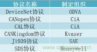 這個(gè)規(guī)則,定義了CAN報(bào)文中幀ID及幀數(shù)據(jù)的使用方式,如將幀ID定義為需要處理該幀數(shù)據(jù)的CAN節(jié)點(diǎn)地址等。根據(jù)應(yīng)用場(chǎng)合的不同,國(guó)際上出現(xiàn)了多種CAN應(yīng)用層協(xié)議,常見的CAN-bus應(yīng)用層協(xié)議如下: