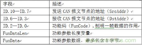 為了給讀者演示CAN應(yīng)用層協(xié)議的開發(fā)和使用方法,下面定義一個(gè)簡(jiǎn)單的CAN應(yīng)用協(xié)議棧,該協(xié)議棧中只用到CAN標(biāo)準(zhǔn)幀中的數(shù)據(jù)幀,幀ID中的11個(gè)位的分配和使用方法如下表所列,協(xié)議中另外還定義了功能參數(shù)長(zhǎng)度變量FunDataLen的功能參數(shù)數(shù)組FunData,該數(shù)組在需要時(shí)可以為某些特定功能函數(shù)提供足夠的控制參數(shù)。