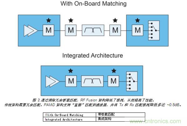 如圖 2 所示,每條通道上實(shí)現(xiàn)元件集成,無需對(duì)元件進(jìn)行板載匹配,從而提升了性能。這將發(fā)射和接收的匹配損耗降低多達(dá) 0.5 dB,進(jìn)而降低電流消耗和熱負(fù)荷。這種布局還在功率放大器的帶寬范圍內(nèi)集成相應(yīng)頻段的濾波器,確保了每個(gè)功率放大器能得到最高效的利用。每個(gè)模塊的改進(jìn)性能使制造商更容易實(shí)現(xiàn)手機(jī)的整體性能目標(biāo)。