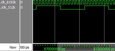 根據(jù)所需的時(shí)鐘頻率為512kHz的時(shí)鐘,而晶振時(shí)鐘的頻率為8192kHz,晶振時(shí)鐘與所需的時(shí)鐘頻率恰巧是16倍的整數(shù)倍關(guān)系,因此需要對8192kHz的晶振時(shí)鐘進(jìn)行16分頻來獲得所需要的時(shí)鐘。根據(jù)整數(shù)倍分頻器的設(shè)計(jì)方法原理,通過ISE9.1邏輯設(shè)計(jì)工具,利用VHDL硬件描述語言來進(jìn)行16分頻的分頻器設(shè)計(jì)。然而16又是偶數(shù),所以需要設(shè)計(jì)的是偶數(shù)分頻器。對設(shè)計(jì)的內(nèi)容通過Modelsim6.5仿真軟件進(jìn)行仿真驗(yàn)證,結(jié)果如圖3-2所示。